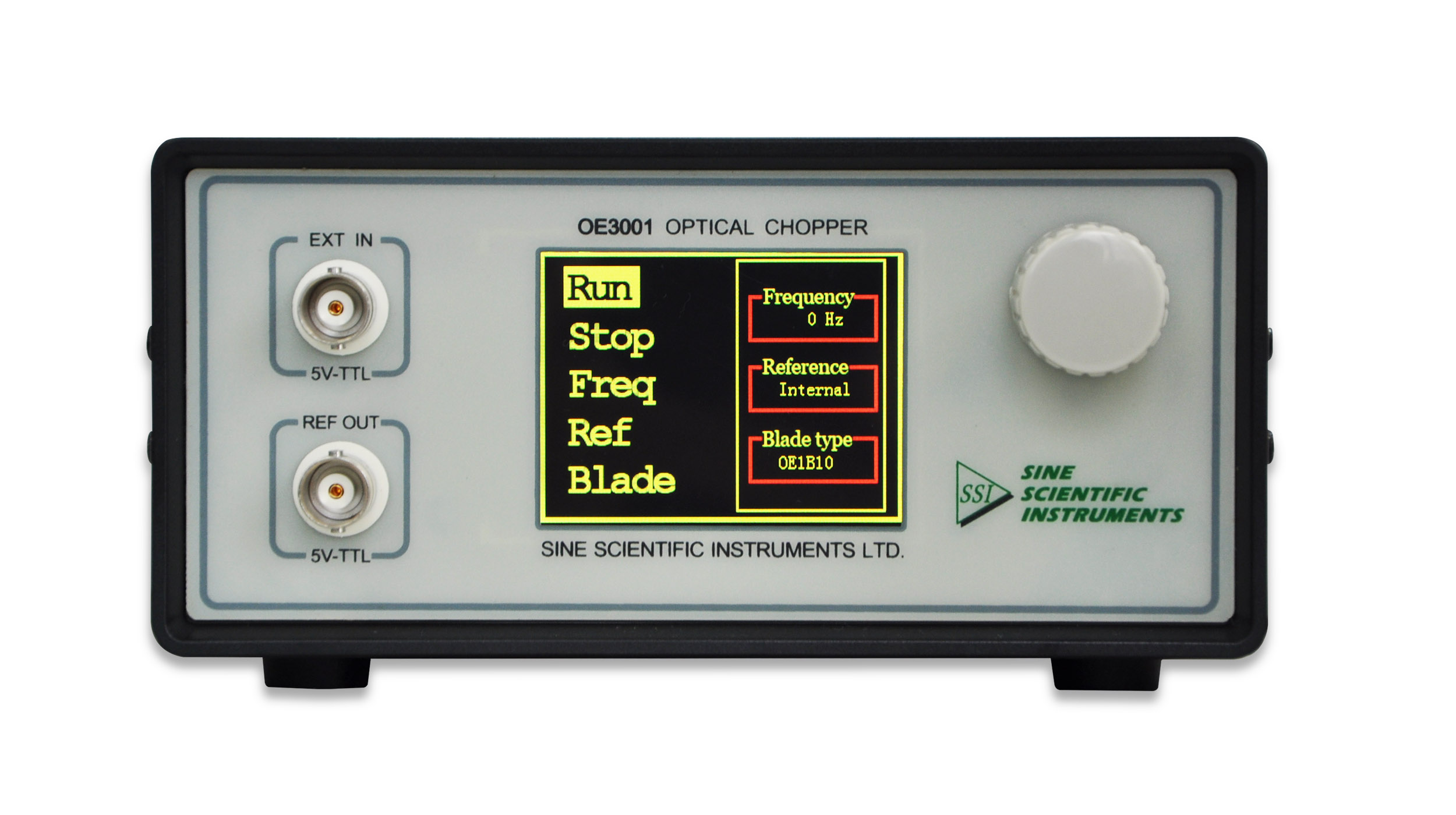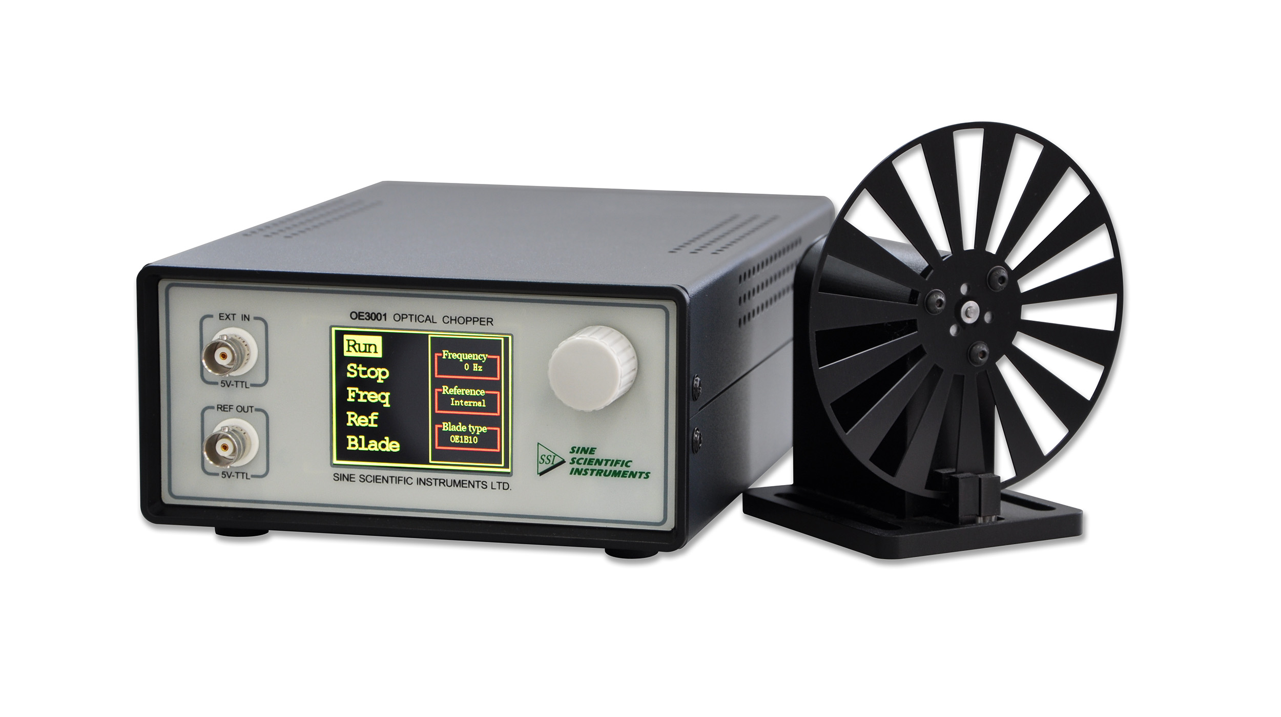 OE3001通过一个 320*240 像素的2.4寸液晶显示器来控制和设置斩波器的功能,配合前面板的控制旋钮(右侧旋钮),通过旋转和按下操作即可实现全部功能。OE3001 可以通过使用不同的叶片来改变斩波频率的范围。本产品的标准配置是10槽叶片,对应的参考输出信号范围是 20 Hz~1000 Hz。其它适用的叶片包括2 槽、10 槽、15 槽、30 槽、60 槽、100 槽以及5/7 槽(用户可根据需要购买所需的叶片)。