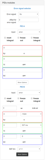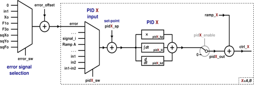 Lock in + PID + Oscilloscope该应用程序有两个PID滤波器,旨在将其参数设置在不同数量级的范围内。此外,PID与辅助加法器和多路复用器相结合,使系统适用于扫描和闭环控制方案