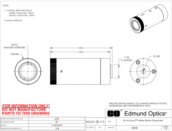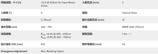 部分参数如下(大角星(Arcturus™)氦氖扩束镜):