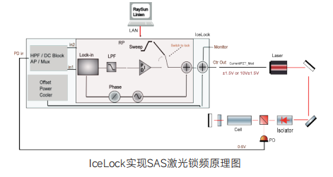 上图为IceLock用于饱和吸收光谱锁频的系统连接原理图,图中方框以内全部通过IceLock实现,用户只需连接对应输入和输出端口后,全部操作均可通过浏览器连接硬件(LAN、Wi-Fi等方式)完成。其他锁频方案请咨询工程师。