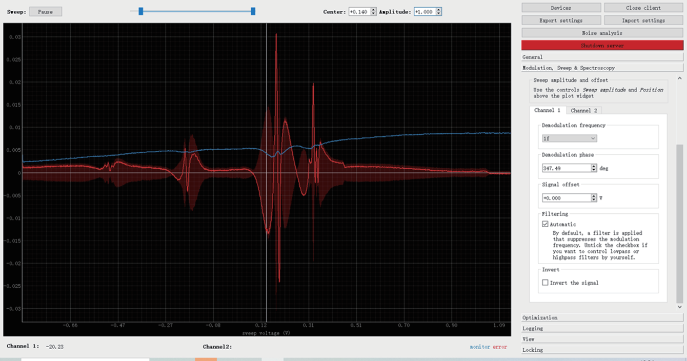 噪声分析功能,记录误差信号的功率谱密度(PSD),用于分析锁定激光器的噪声并优化 PID 参数
