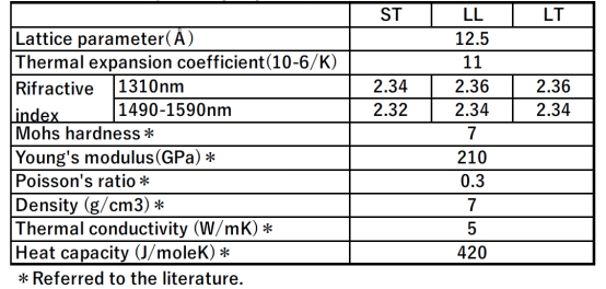 Rare-earth Iron Garnet (RIG) is an extremely stable oxide that can be represented by the chemical formula of R3Fe5O12. The typical physical property values of RIG are listed in the Table below.