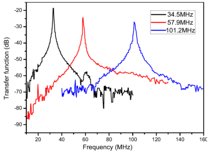 通过测量传输函数可以得到谐振型光电探测器随频率的增益性能,典型结果如下图所示,谐振探测频率分别为34.5 MHz,57.9 MHz,101.2 MHz.