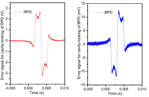 RPD(红)和BPD(蓝)锁腔误差信号比较以及RPD(红)和BPD(蓝)锁相误差信号比较