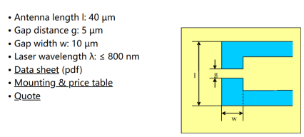 BATOP GmbH是一家成立于2003年的德国高科技私营公司,公司的光电导天线可用于使用脉冲激光器发射和检测太赫兹脉冲波长为 800 nm、1060 nm 或 1550 nm。它们可以是光纤耦合的,并配备不同的导致发散、准直或聚焦太赫兹光束的硅衬底透镜类型。