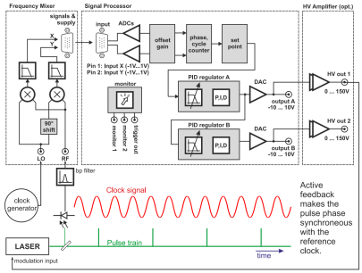 Phaselock激光锁相/锁模控制器:激光锁相装置(锁模控制电路)PhaseLock通过相位比较器鉴别相位误差,自动搜索检测有效锁点,采用双路PID反馈调节, 完成相位锁定。应用于连续激光器的光学频率锁相、飞秒激光器的脉冲包络相位控制、电子振荡器频率或相位稳定。